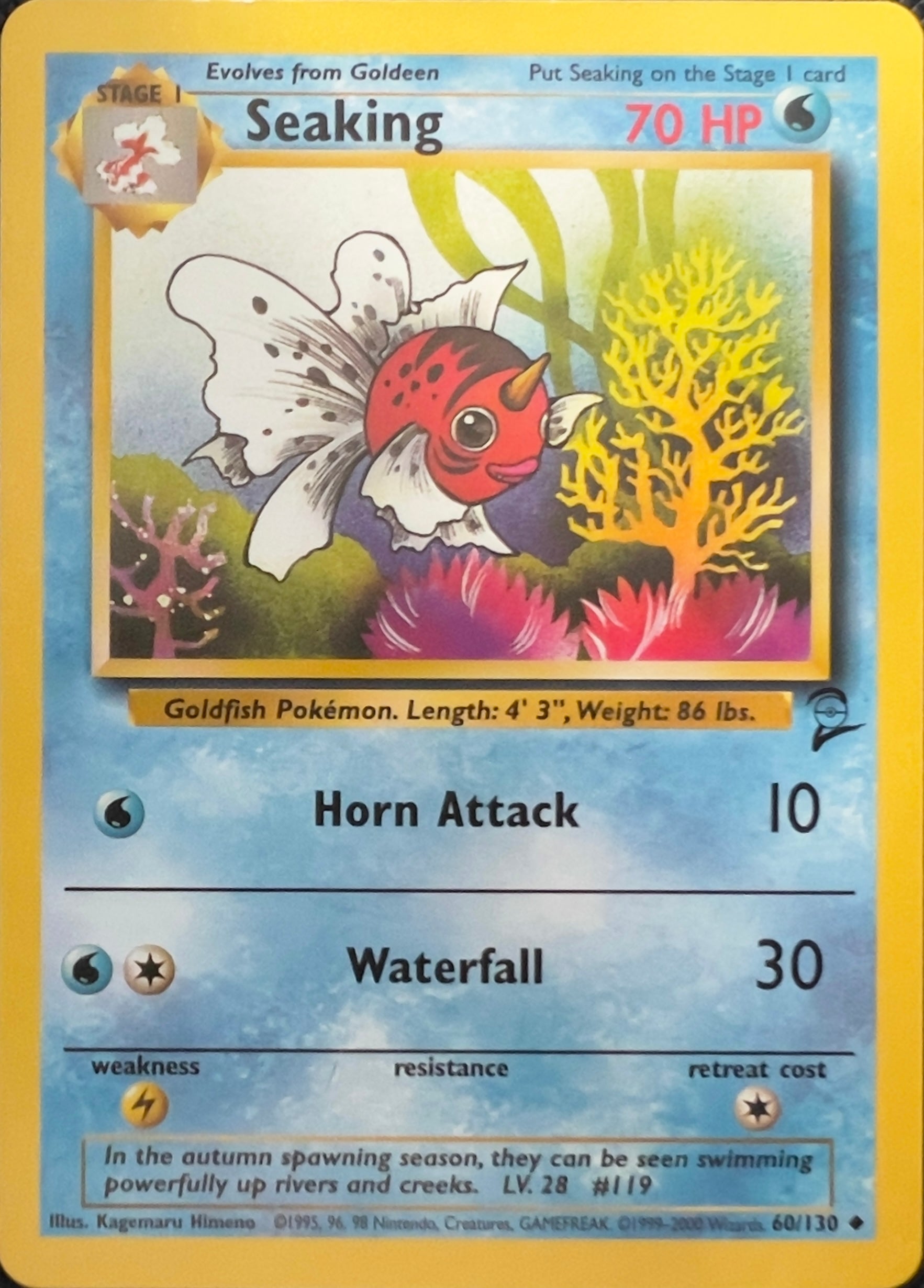 Pokémon WOTC: Seaking (Non-Holo) fra Base Set 2 (Wizards of the Coast, 2000) er et klassisk water-type kort med artwork af Kagemaru Himeno. Illustrationens bløde farver og simple komposition indfanger den rolige og nostalgiske stemning, som kendetegner Base Set 2 – et sæt, der samlede nogle af de mest ikoniske kort fra de tidlige år.
